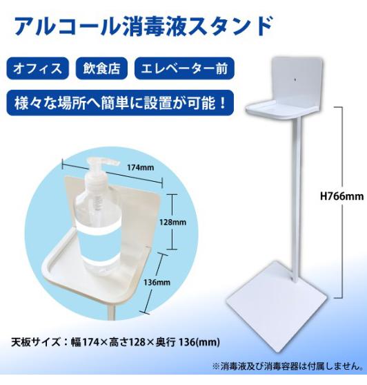 ボトルの落下や液だれを防ぐ溝付きのアルコール消毒液スタンドです。